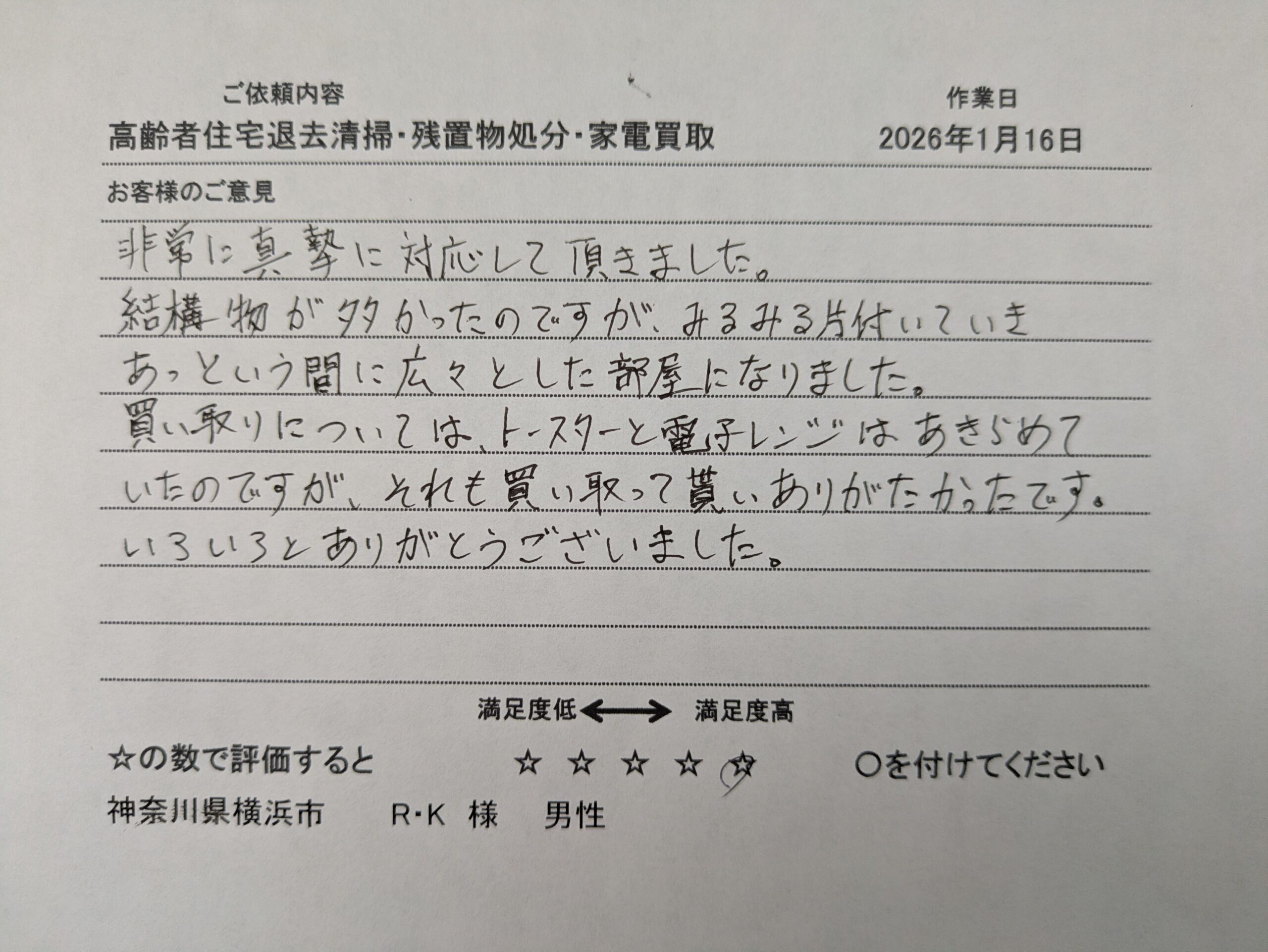 高齢者住宅退去清掃、残置物処分、家電買取⭐⭐⭐⭐⭐