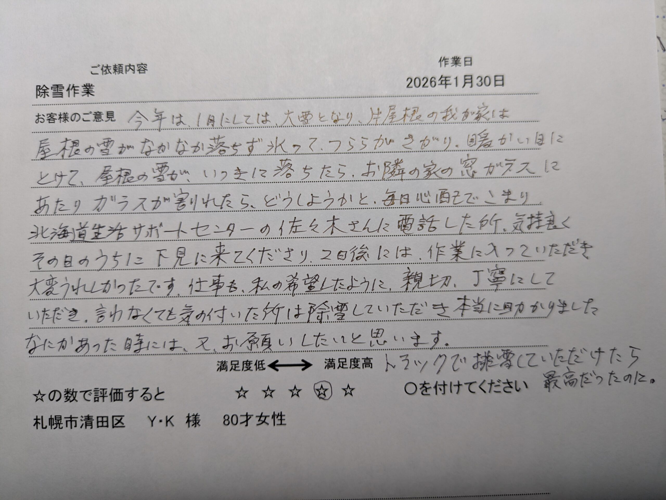 大量の雪で2名作業で2日間かかりましたが息子さんも喜んでいただき安心しました。 有難うございます。